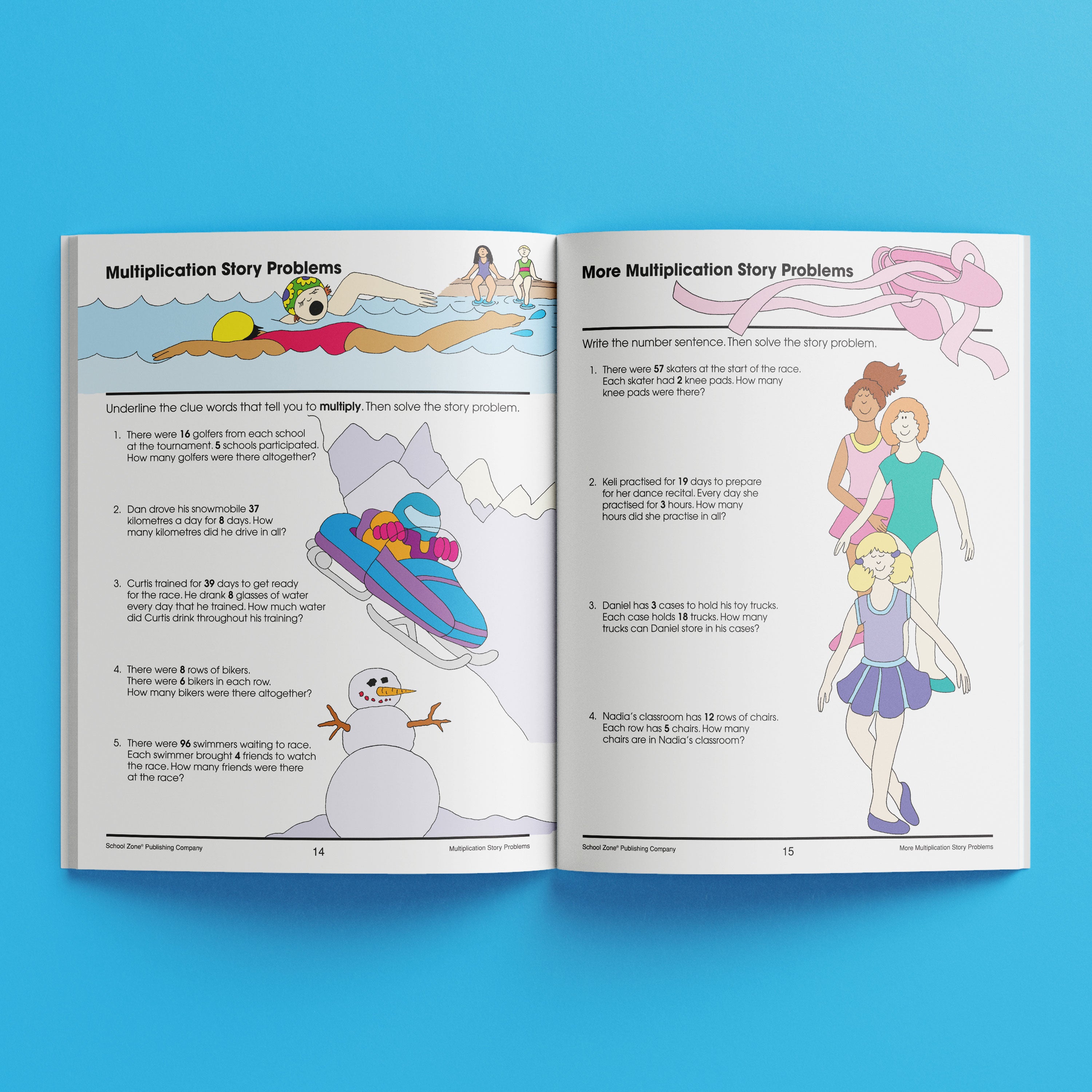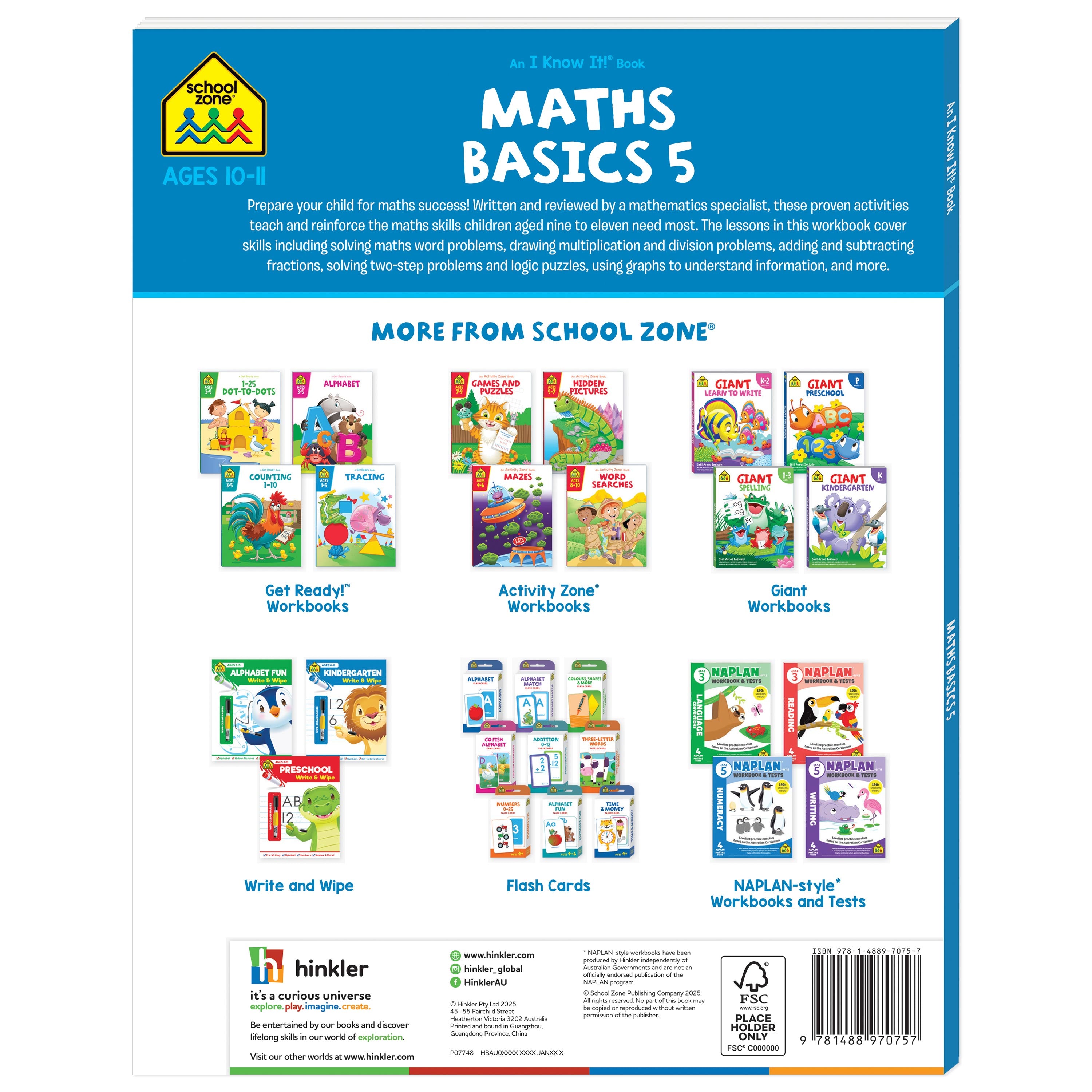 The lessons in this workbook cover skills including solving maths word problems, drawing multiplication and division problems, adding and subtracting fractions, solving two-step problems and logic puzzles, using graphs to understand information, and more. School Zone level 5 for ages 9-11