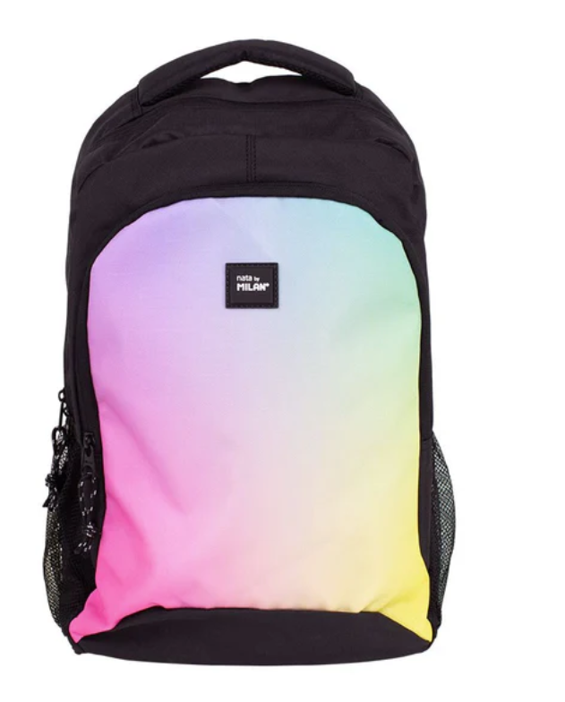 Milan classic urban backpack with 2 zips. Sunset series, black colour. A combination of gradient colors inspired by the sunset, with black and white details. Zipper puller with string. Main compartment with a protective laptop sleeve. Front pocket and two quick-access side pockets. Adjustable straps, padded and breathable back.